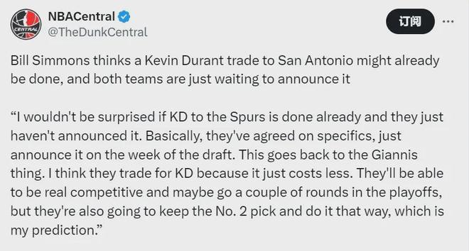 名记Simmons在某档节目中认为杜兰特离开太阳前往马刺的交易可能已经达成,仅需等待两队的官宣......